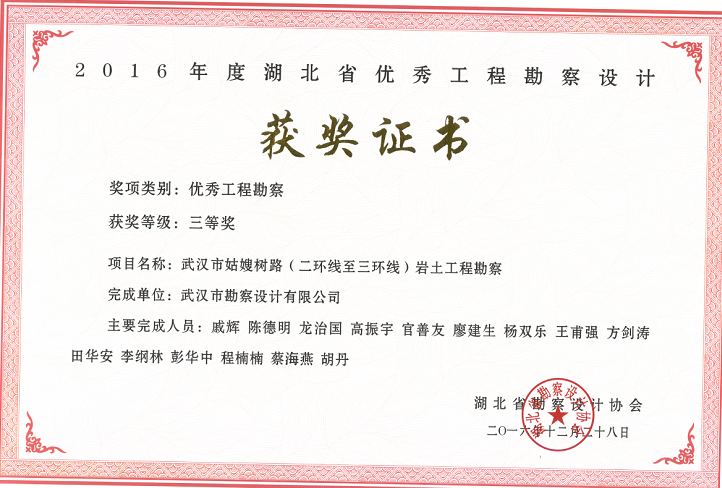 武漢市姑嫂樹路(二環(huán)線至三環(huán)線)巖土工程勘察獲2016年度湖北省